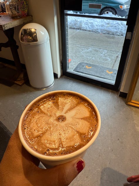 -A pistachio mocha from our local coffee shop owned by Reya, who’s become a friend over the past few months. She’s an illustrator and the walls of the coffee shop are filled with paintings made by local artists. She tells me about an artist that was commissioned by a customer who saw her work on the walls and wanted it for her office, how happy she was to see this artist get the recognition she deserves.