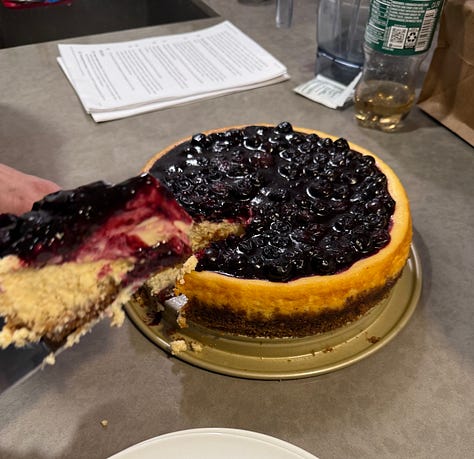 -Sam makes a blueberry lemon biscoff cheesecake for our movie night (an original flavor pairing conceived by our friend Shaili).